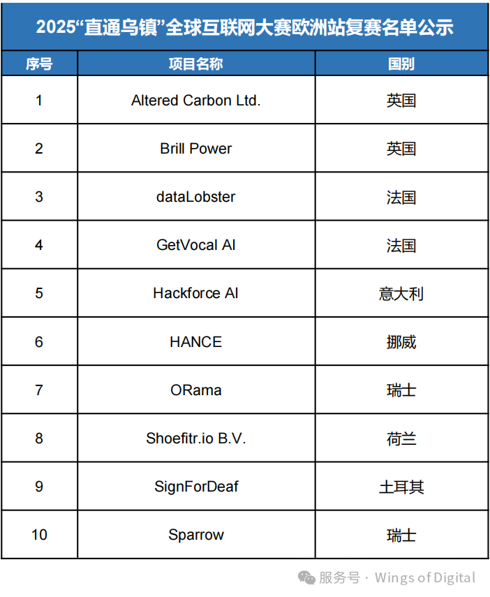 2025“直通乌镇”全球互联网大赛欧洲站初赛经专家评审,最终从众多优质项目中选出十强入围复赛。现将复赛名单予以公示: